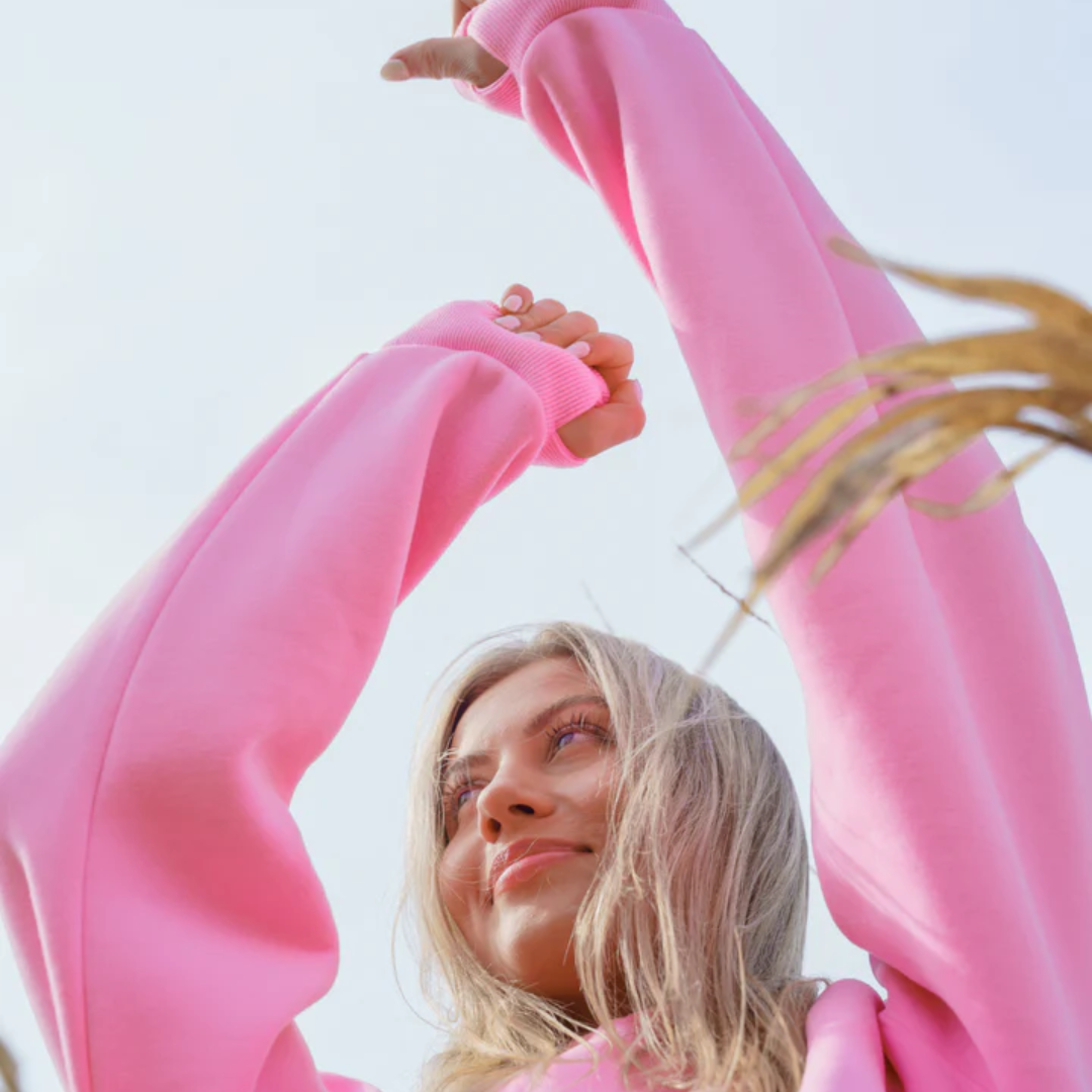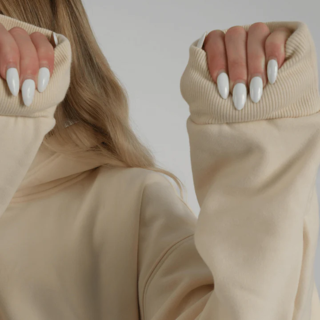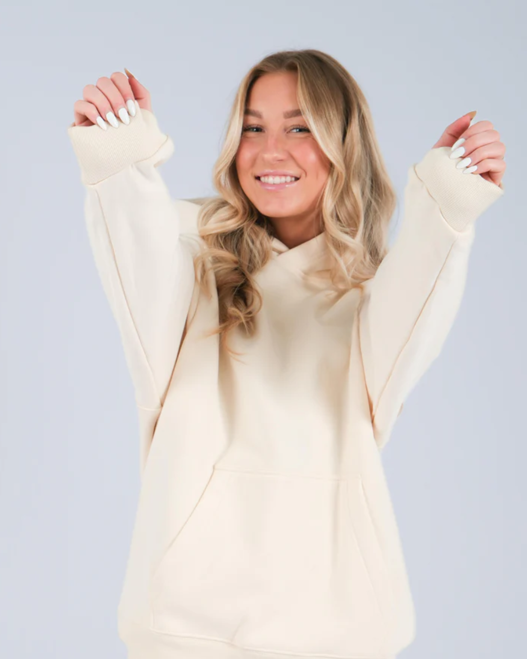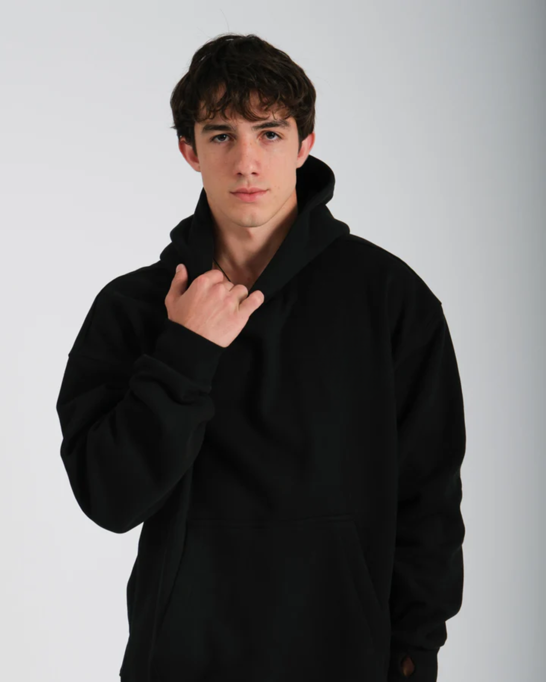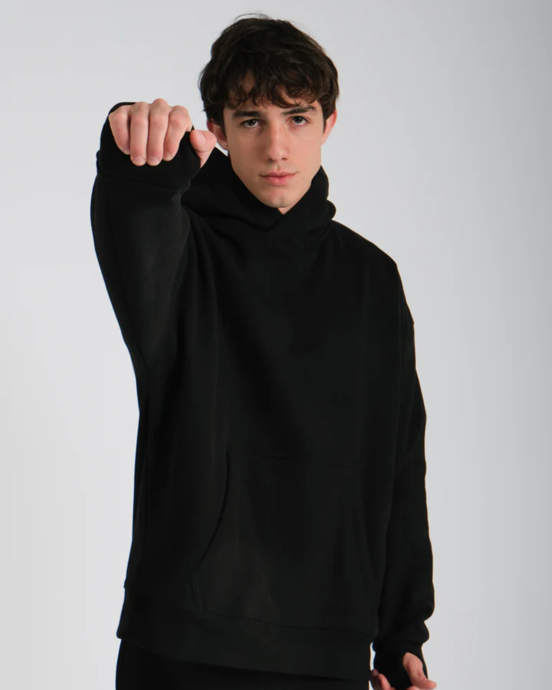 Fit: Slightly oversized with drop shoulders and thumbholes